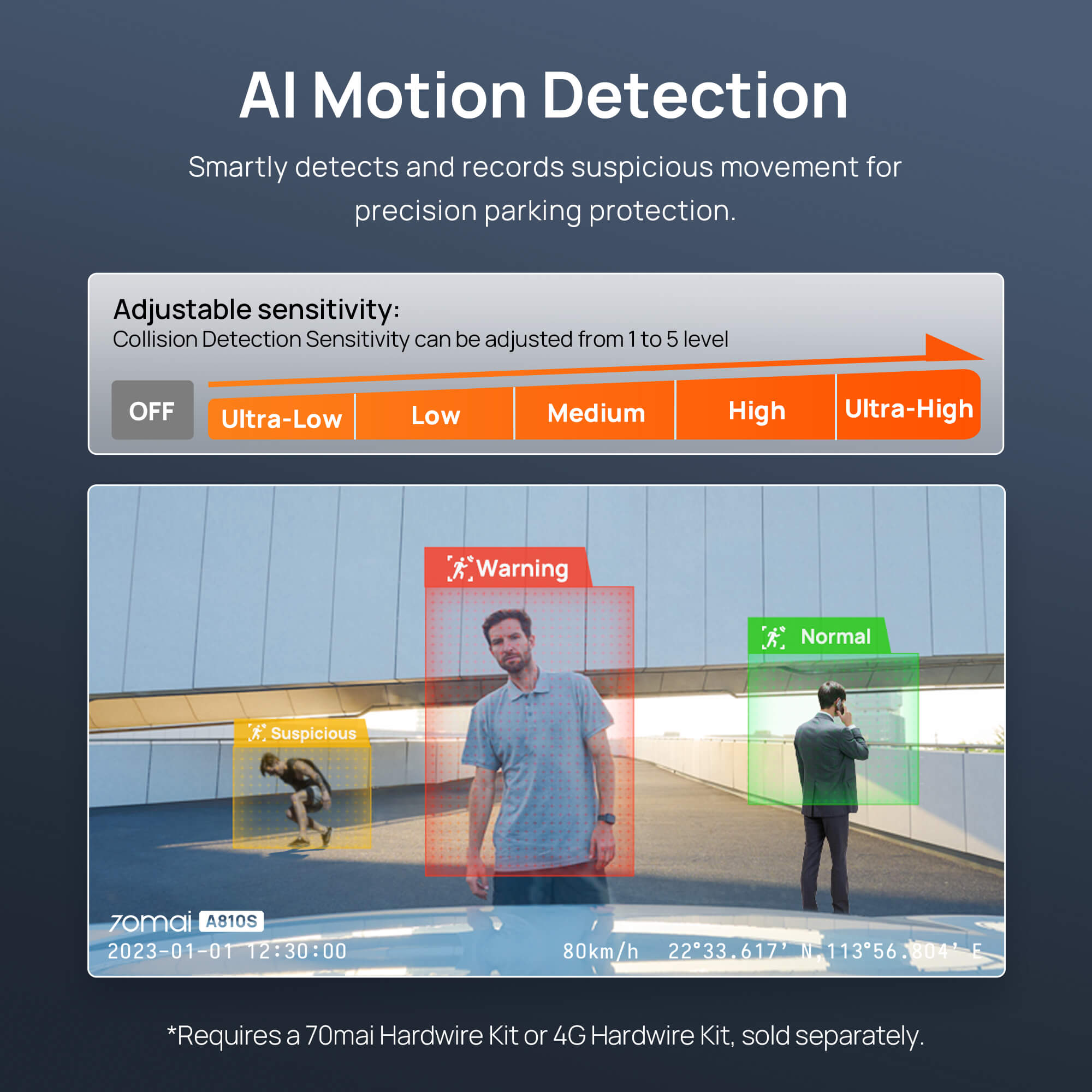 - Al Motion Detection instantly spots suspicious movement near your vehicle, triggering a 30-second synchronized recording from both channels. (Requires a 70mai Hardwire Kit or 4G Hardwire Kit).