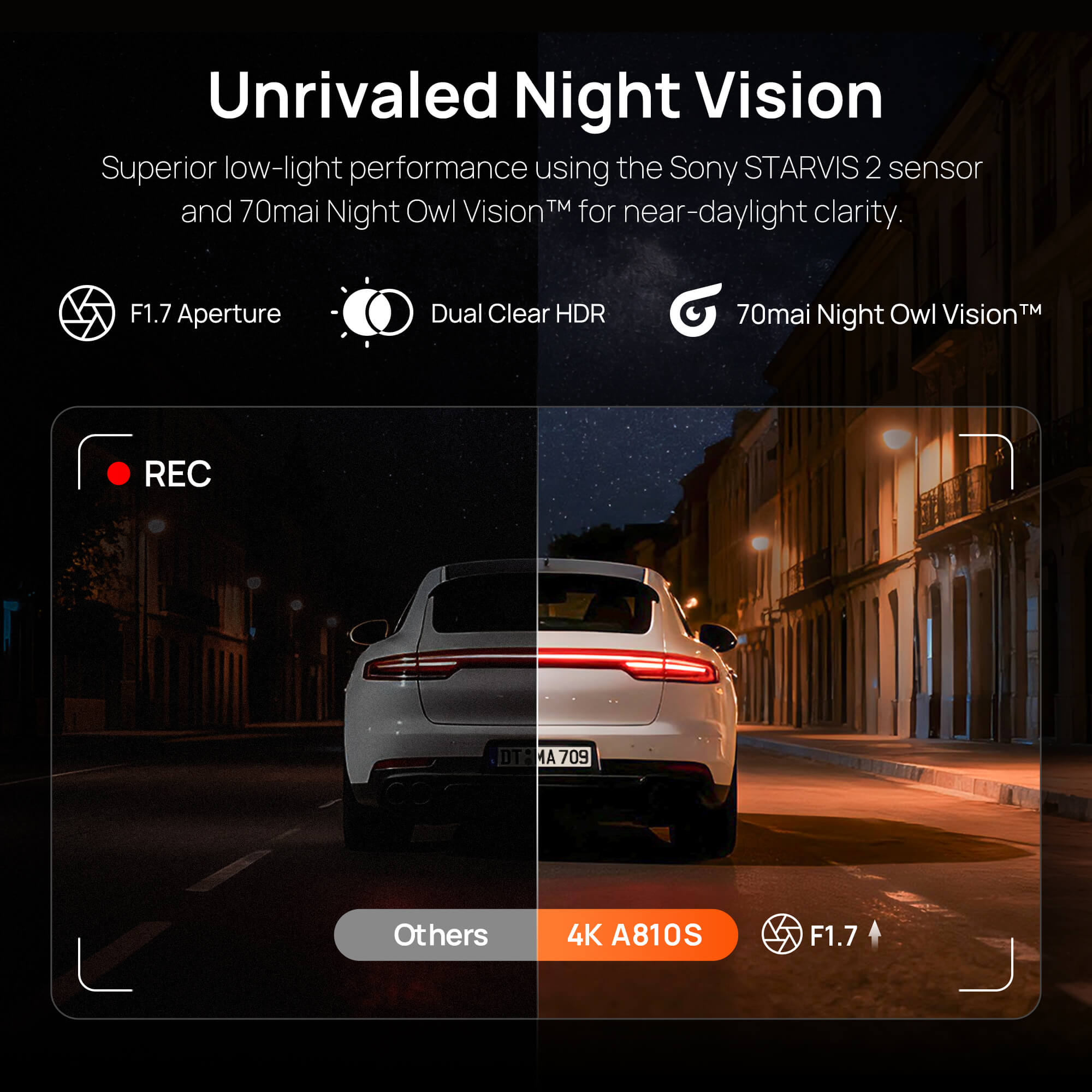 The 4K A810S delivers unparalleled night-time footage with Sony STARVIS 2 technology and 70mai Night Owl Vision™. These features enhance exposure, reduce noise, and control glare, providing clear, balanced visuals when driving in low-light conditions.